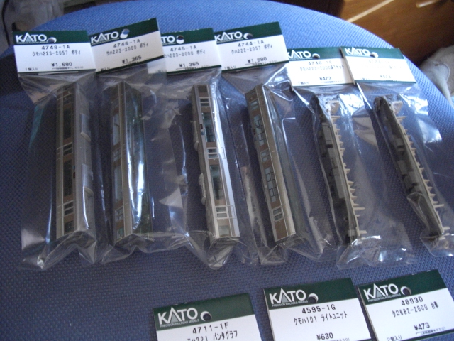 今回買ったのは、223系2000番台2次車の4両分と台車です。あと、たぶれっと製の2500番台改造のデカールが手に入れば2500番台に改造したいので、その時のために一応ライト、床下セット、パンタグラフを買っておきました。