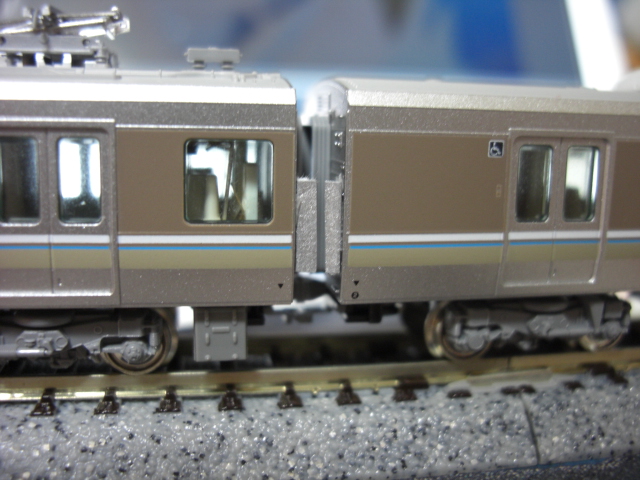 どうでしょうか?かなり見栄えが良くなった気がします。まだ試しに付けてみた段階なのでこの3種類の車両のみですが、付ける前よりも連結面に目がいくようになりました。でも、少し走らせて(モーターなしなので転がすという感じ?)みると、右カーブの直後左カーブといった状況やと脱線するか、しそうになります。カーブの後一箇所でも直線があると大丈夫と思います。