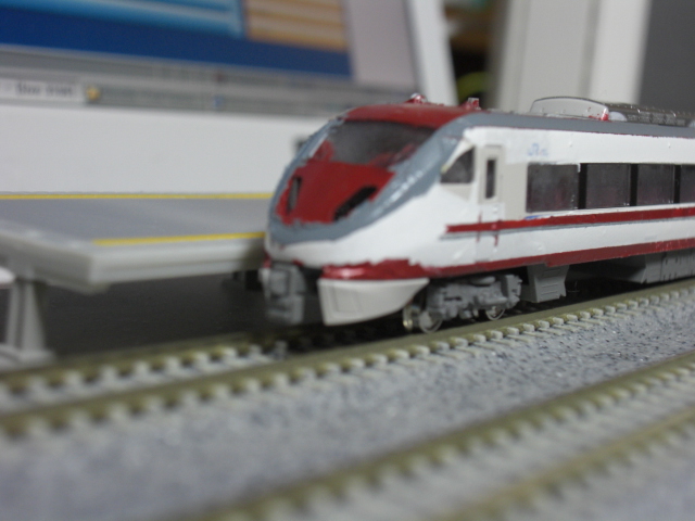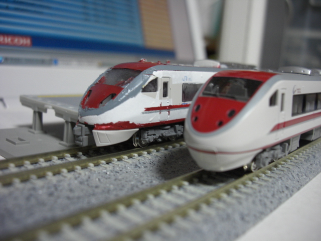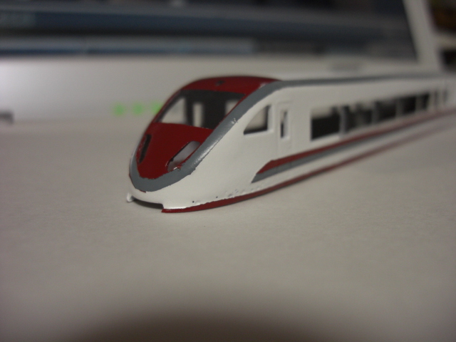 車両全体を塗装したのは今回が初めてでした。ちなみにこれは、実験台(ようするに失敗作)です。全く何も考えずに試したので、塗装の際にしなければならない基本的なことをかなり多く忘れてました。ガラス部分を外し忘れたまま塗装したり、ちょっと考えればわかることですが、白→赤→グレイの順番、つまり占める面積の多い順に塗装してしまいました。普通逆ですよね。自分の中でまず大まかに塗装してその後に細かい部分を塗装していくものと思い込んでいたので。マスキングテープのムダ使いをしました(大部分を占める白をマスキングしたため)。